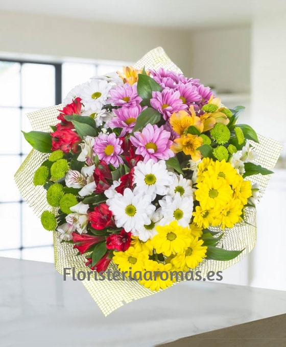 Alegre, bonito y fresco Bouquet Flores Berlín en tonos rosas, blancos, amarillos, rojos, blancos. Sin duda, si queremos alegrar el día a una persona es el ramo adecuado. Es un detalle bonito y especial que presentamos, elaborado con flores de regalo. Un poco de la madre naturaleza trasladado a un bonito ramo de flores silvestre. En este nuestros ramos de regalo, predominan las margaritas en tonos variados y las adornan unos bonitos verdes, que le dan un aire sin duda muy campestre.