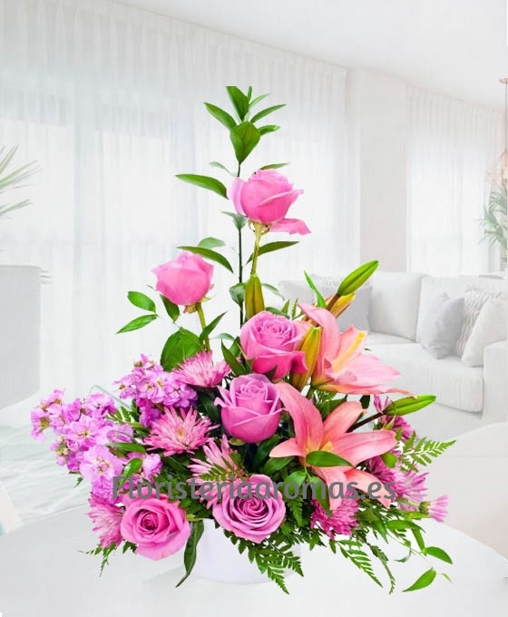Precioso por sus tonos y muy elegante por sus hermosas flores es este Centro de Rosas y Lilium Rosados. Es un centro de flores de regalo compuesto por algunas de las mejores flores que nos ofrece la naturaleza, como son las rosas rosas para regalar y el lilium, las margaritas, todo ello decorado con hermosos verdes sobre una base de cerámica. Somos expertos en el arte floral, podemos ayudarle a hacer el regalo perfecto. Haremos llegar a su ser querido, todo el amor y alegría que quiere demostrar con este bonito centro de rosas a domicilio. Sin duda, lo que quiere es hacer el mejor regalo.